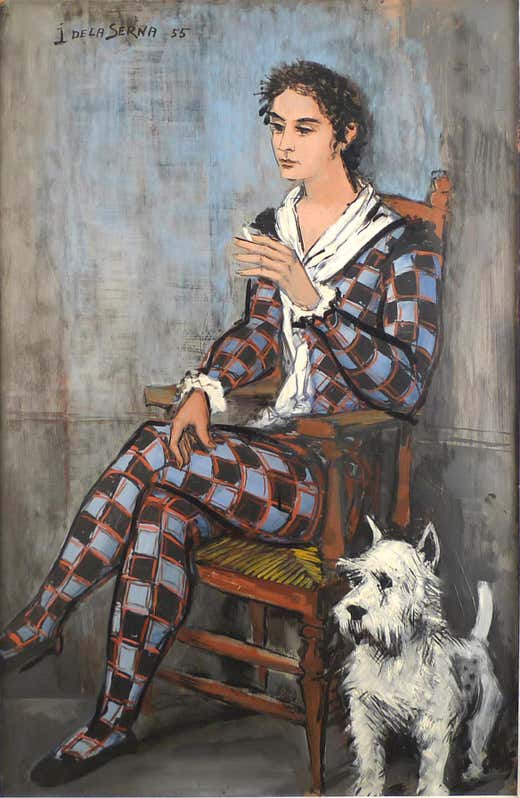 - "Harlequin and his dog", 20th Century oil on cardbard by Ismael de la Serna